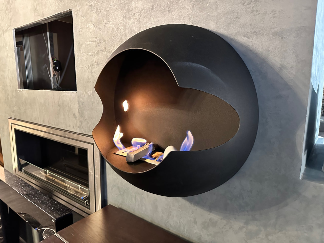Современный био камин Firezo Apple круглой приплюснутой формы настенного типа для квартиры или дома – находка для интерьера в стиле лофт, хай-тек и других, где приветствуется минимализм и интересные детали.