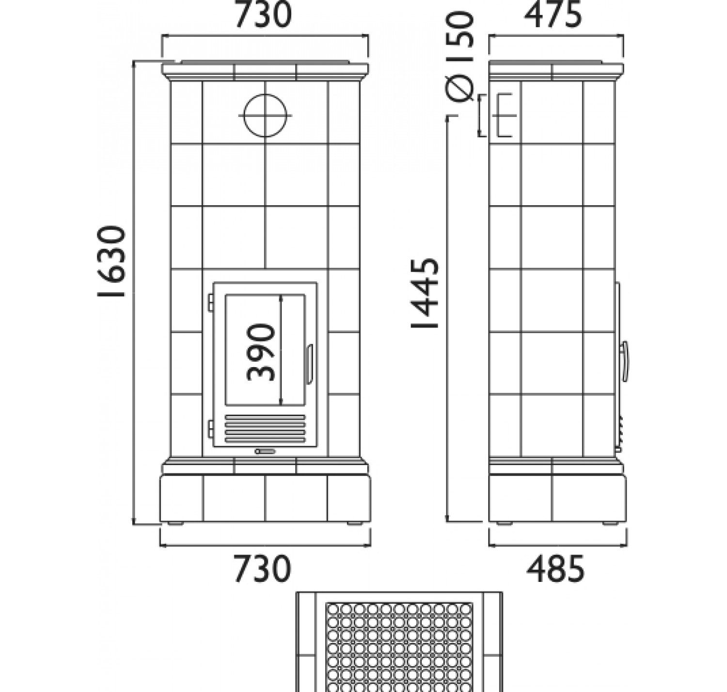Обратите внимание на высоту печи — 1 м 63 см, она значительно выше стандартных размеров. Печь производится с различными вариантами кафеля для облицовки.