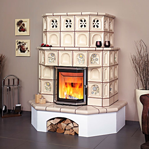 Пристенная облицовка из изразцов антично-кремового цвета.