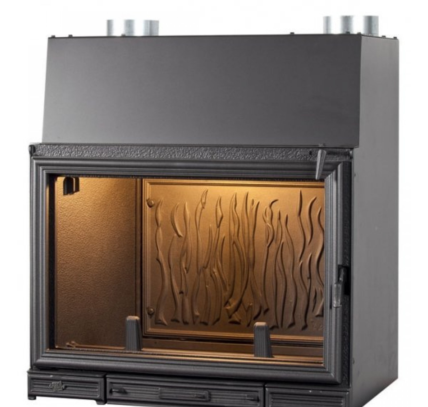 Топка Sunflam70 полностью чугунная – благодаря толстым стенкам из чугуна легко удержать на долгий период времени жар из очага. Теплонакопительные свойства чугунной топки настолько же хороши как и теплоотдающие, поэтому топка из чугуна сможет равномерно распространять тепло по территории дома.