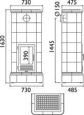 Два варианта исполнения, различающиеся по способу распределения горячего воздуха в помещении: естественная конвекция (N) и принудительная вентиляция (V). В коробе имеются 4 отверстия для подключения к системе разводки горячего воздуха. Топка снабжена системой вторичного дожига.