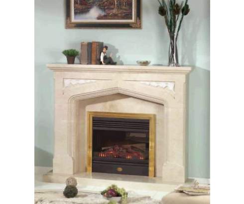 Этот простой и элегантный камин выполнен из мрамора кремового оттенка. Верхняя его часть украшена лаконичным растительным орнаментом из натурального камня белого цвета.